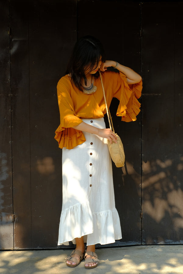 Linen Midi Skirt with Asymmetrical Ruffle Hem