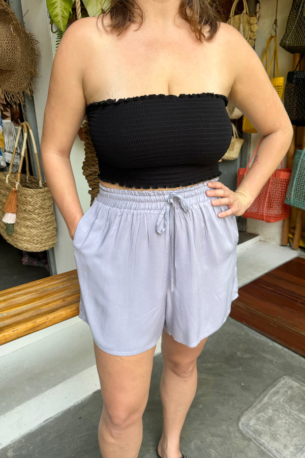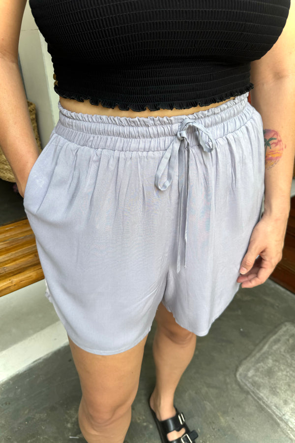 These simple, everyday shorts come in purple, light grey, light cocoa, and navy, offering a versatile addition to your wardrobe. Made from soft viscose, they feature an elastic waistband for comfort and convenient pockets. Perfect for casual wear!