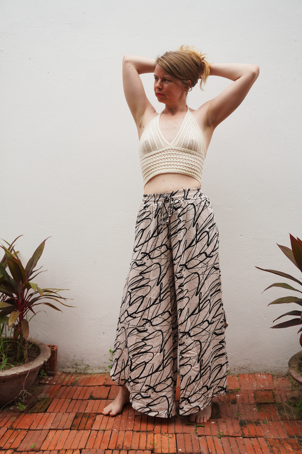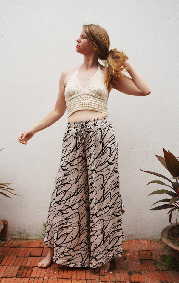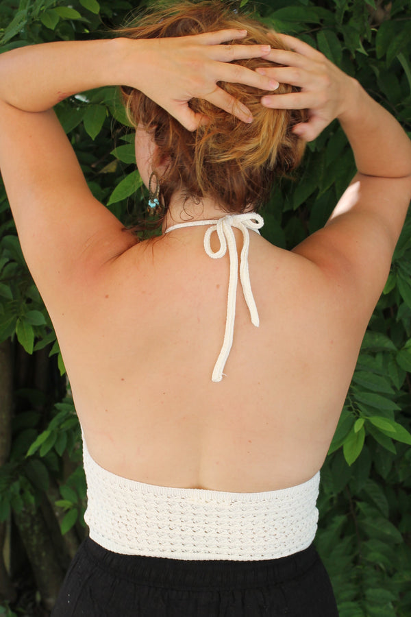 This halter-style crochet crop top is a sweet nod to sun-drenched days and easy weekends. The open back and adjustable neck ties give it that effortless, laid-back charm — perfect for pairing with denim shorts or wide-leg trousers.