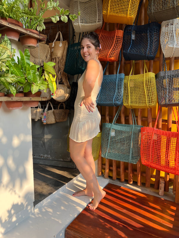 This crochet mini-dress features a flattering V-neck, delicate spaghetti straps, and multiple weave patterns, creating a unique textured look. Made from 100% acrylic, it offers a comfortable stretch for a fitted yet flexible feel. The dress measures 83 cm in length (measured from size M). Please allow for a margin of 1-2 cm difference due to manual measurement.