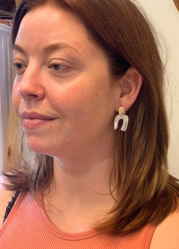 These earrings feature a harmonious mix of gold and silver, with a small gold square that has an arched top half and a large U-shaped silver bottom. Both sections are engraved with a zen-inspired pattern, offering a tranquil yet stylish design. Width: 2.5 cm | Height: 3.5 cm | Alloy: Matte Gold/Silver