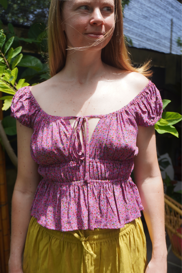 Available in blue or purple florals, it features a tie-front and an elastic waist for an easy, flattering shape. The neckline can be worn on or off the shoulder — a simple switch that transforms your look from casual to flirty in seconds.