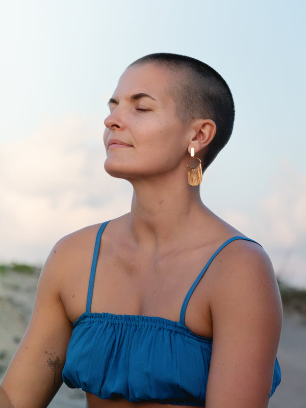 Crafted from 18K gold-plated brass, these oval-shaped earrings feature a delicate line of fringe along the bottom, adding a touch of elegance and movement. Measuring 2.7 cm in width and 5.6 cm in height,