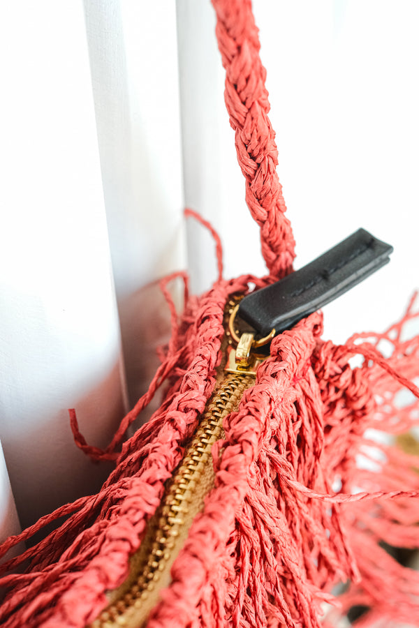 This vibrant punch-colored shoulder bag, crafted from paper, features a unique half-moon shape with playful fringe detailing. It includes a zip closure and a lined interior for added functionality. The bag has a drop length of 48 cm (non-adjustable), a height of 17 cm, a length of 27 cm. Please allow for a margin of 1-2 cm difference due to manual measurement.