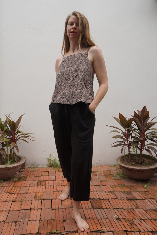 Handcrafted in our Danang studio, these soft black culottes are the definition of comfort meeting quiet style. The relaxed fit, wide leg, and just-above-ankle length (on our 173cm models) make them the pair you’ll live in — from morning markets to easy evenings out.