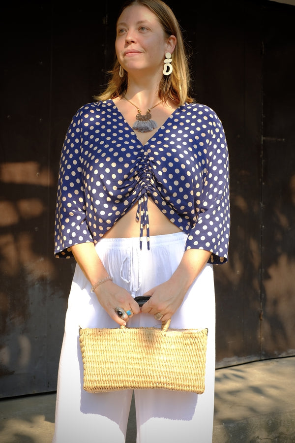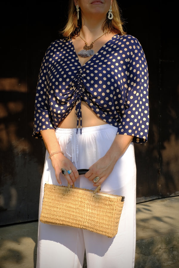 This crop top features a V-neck, 3/4 sleeves, and an adjustable vertical drawstring that allows you to customize the crop style and length. The light tan polka dots add a subtle touch to the 100% viscose fabric.