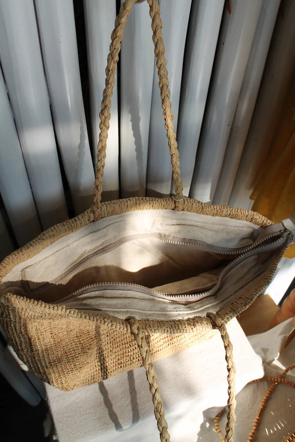 With its natural raffia texture and softly structured shape, this shoulder bag feels effortlessly organic. The zip closure and lined interior make it functional, while the relaxed shape gives it that laid-back charm perfect for summer days.