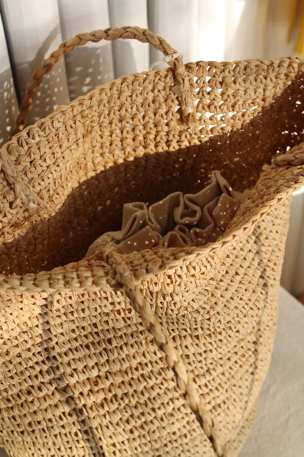 A relaxed carryall with a natural raffia texture and an easy, unlined shape. It comes with a small drawstring inner bag — perfect for tucking away keys, sunnies, or a few essentials. Lightweight and beach-friendly, this tote brings a touch of coastal ease wherever you go.