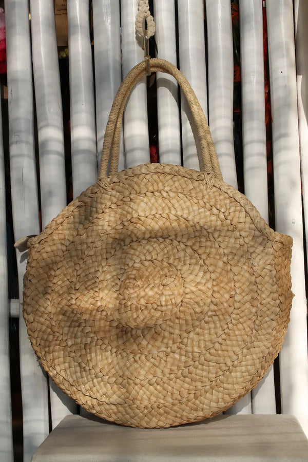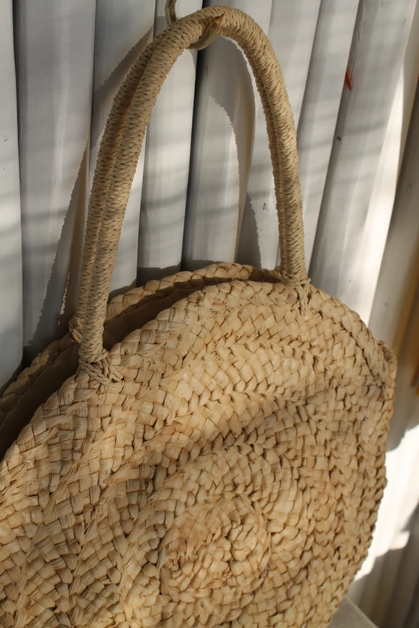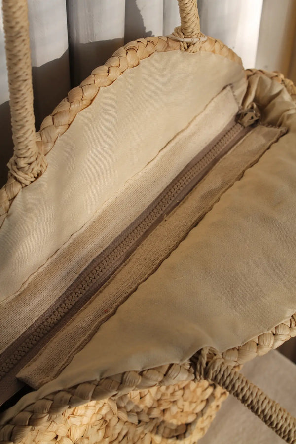 With its beautifully structured round silhouette, this corn husk shoulder bag feels both organic and sophisticated. It’s lined inside and finished with a zip closure, making it a practical yet statement-making piece for sun-filled days out.