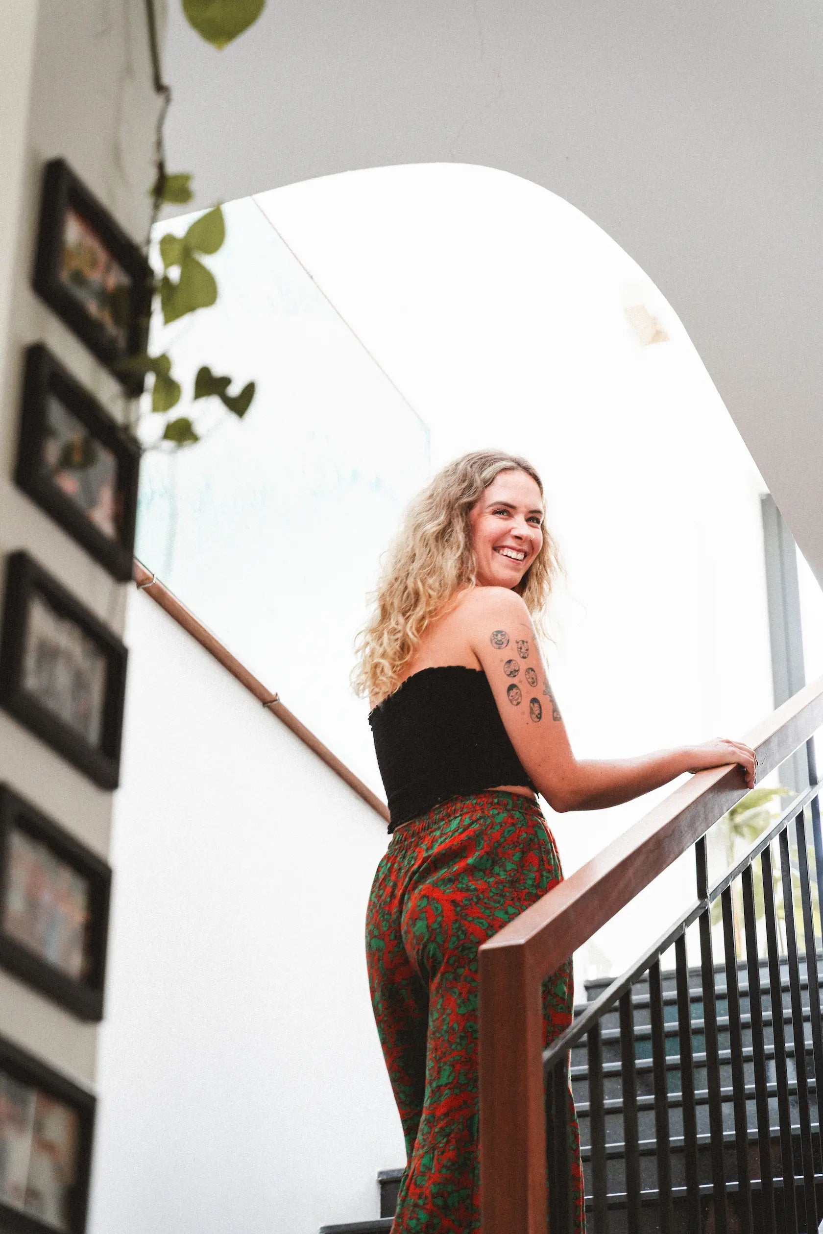 Add a little extra movement to your stride! These vibrant pants are all about playful energy and effortless comfort, featuring a unique red and green botanical print and a tiered ruffle at the bottom that adds a breezy, feminine touch. The lightweight viscose fabric keeps you cool and comfortable even on the warmest afternoons.