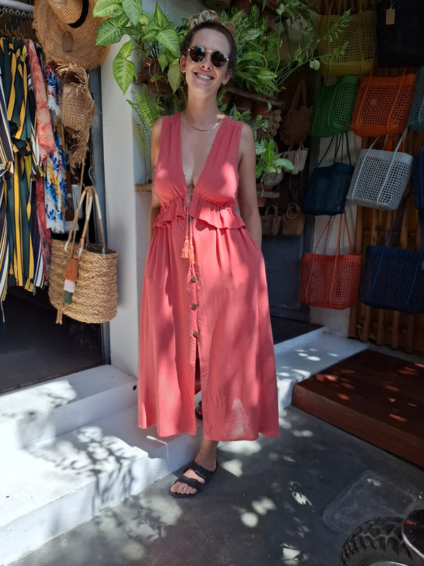 Made from 100% viscose, this sleeveless dress features a plunging neckline and a drawstring under the bust for a customizable fit. The dress falls just between the calf and ankle for a flattering, versatile silhouette.