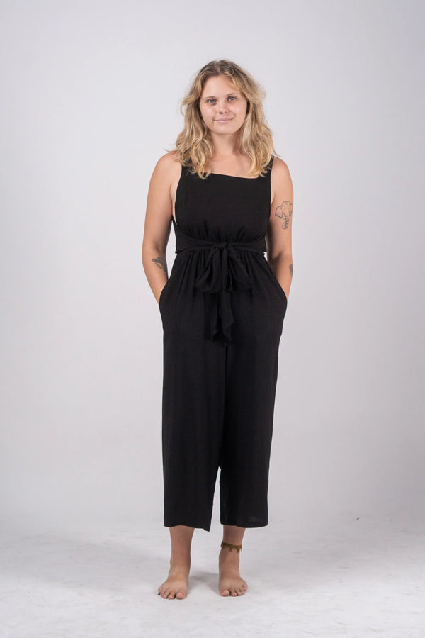 Made from 100% viscose, this jumpsuit features a square neckline, sleeveless design, and a tie front for a customizable fit. The button back closure and pockets add functional detail to this stylish piece.