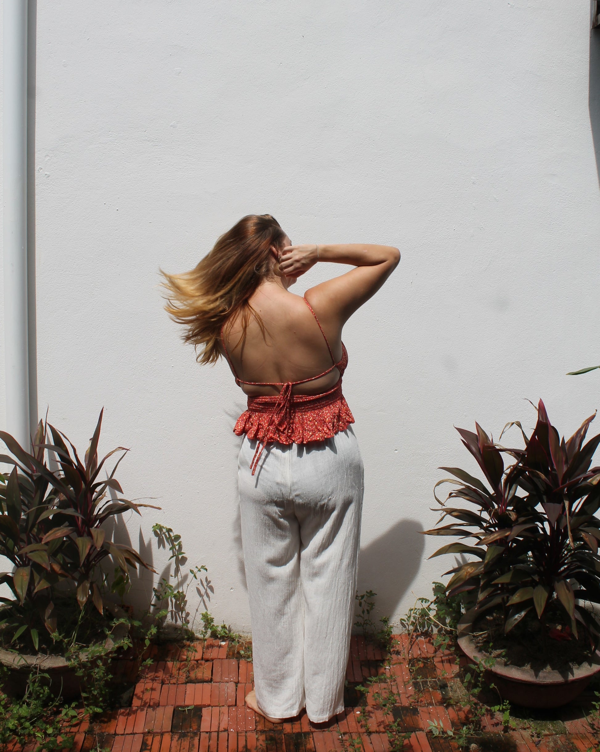 A smocked waist flatters without feeling tight, while the deep V neckline and open back add a hint of confidence. Adjustable shoulder straps that tie mid-back let you customise your fit — an easygoing, flattering piece that pairs beautifully with linen pants or a wrap skirt.