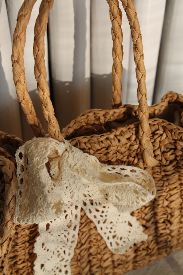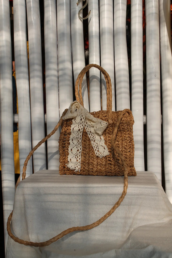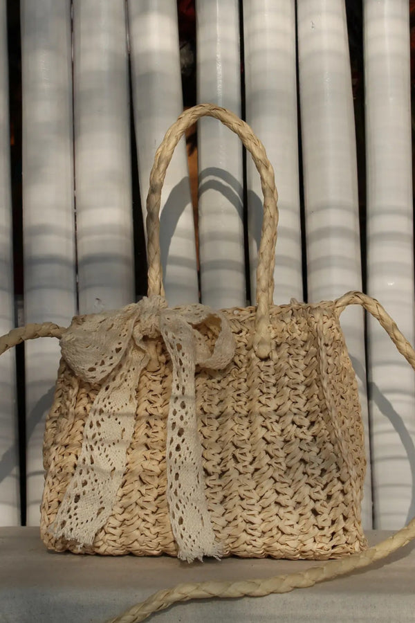 This structured crossbody bag combines playful details with natural texture. The bowtie accent adds a soft, feminine touch to the clean silhouette, while its zip and magnetic snap closures keep everything neatly in place.