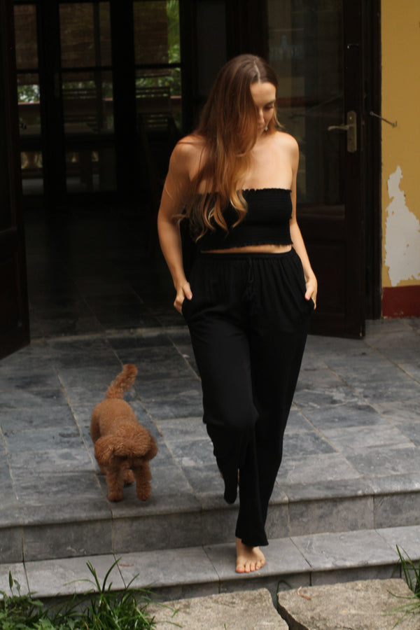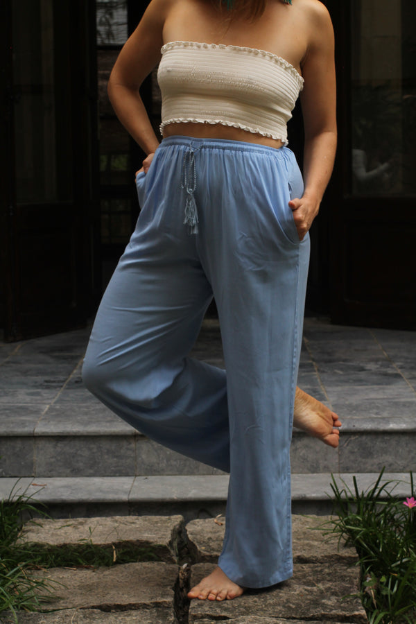 Made from 100% viscose, these pants feature a drawstring at the waist for an adjustable fit, with tassels at the end of the drawstring for a playful detail. The pants also include pockets for added convenience.