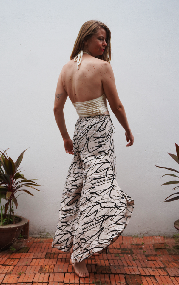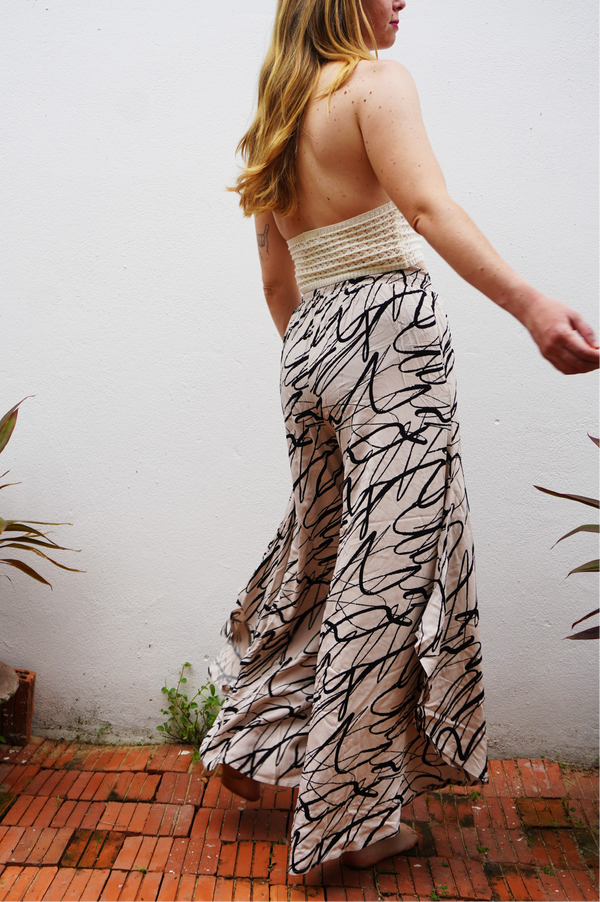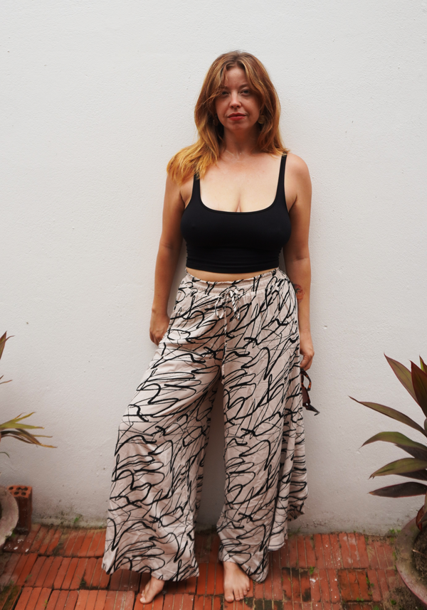 The cream base and bold squiggly print bring playful movement, while the wide legs and side splits add effortless drama. A drawstring waist and pockets keep them comfortable and wearable — easy to style up or down, whether you're wandering lantern-lit streets or lounging by the river.