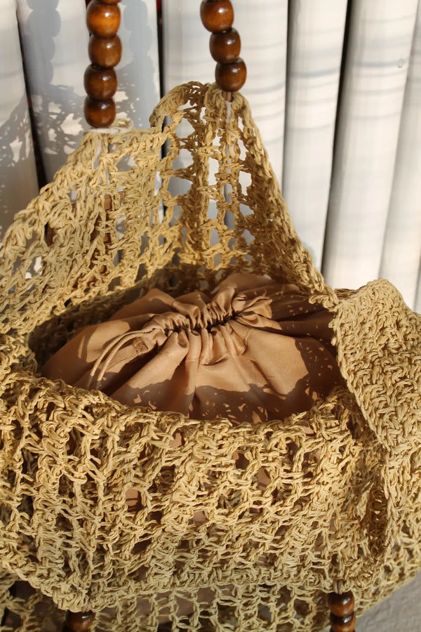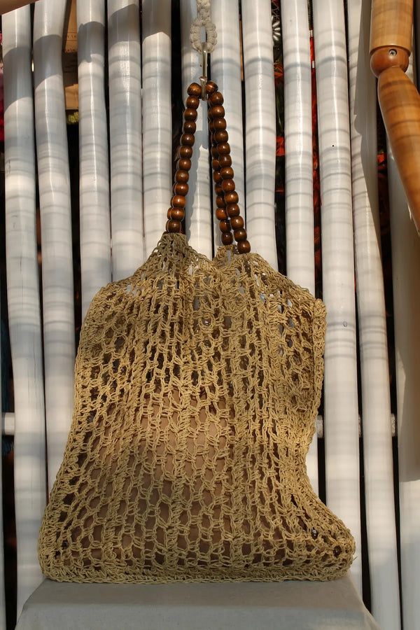 With its mix of wooden beads and natural paper weave, this shoulder bag blends modern texture with bohemian charm. It’s lightweight but structured, finished with a drawstring top to keep your essentials secure — a standout piece for those who love something just a little different.