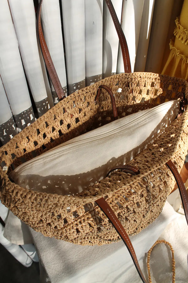 A textural favorite with plenty of charm. This woven paper-and-PU tote features a detachable lining, zip closure, and generous space for daily essentials (plus a little extra).