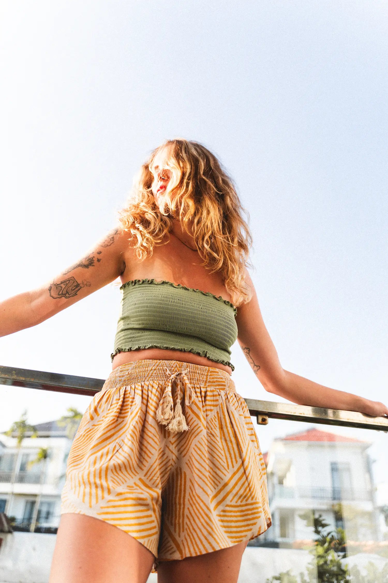 Bring a burst of sunshine to your daily rotation with these playful, high-waisted shorts. They feature a vibrant yellow diagonal stripe, crafted from 100% viscose. These shorts are incredibly soft, lightweight, and breathable.