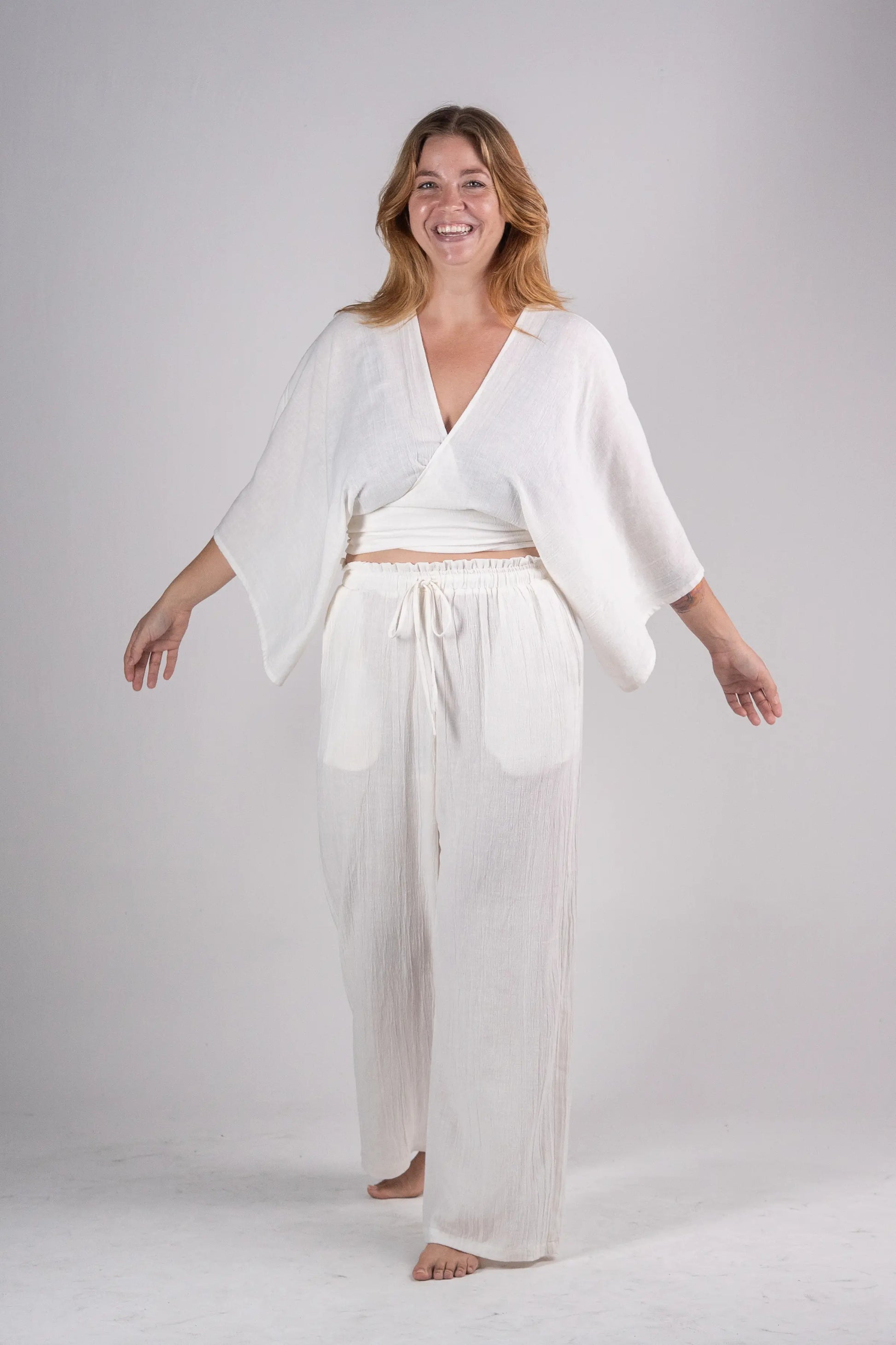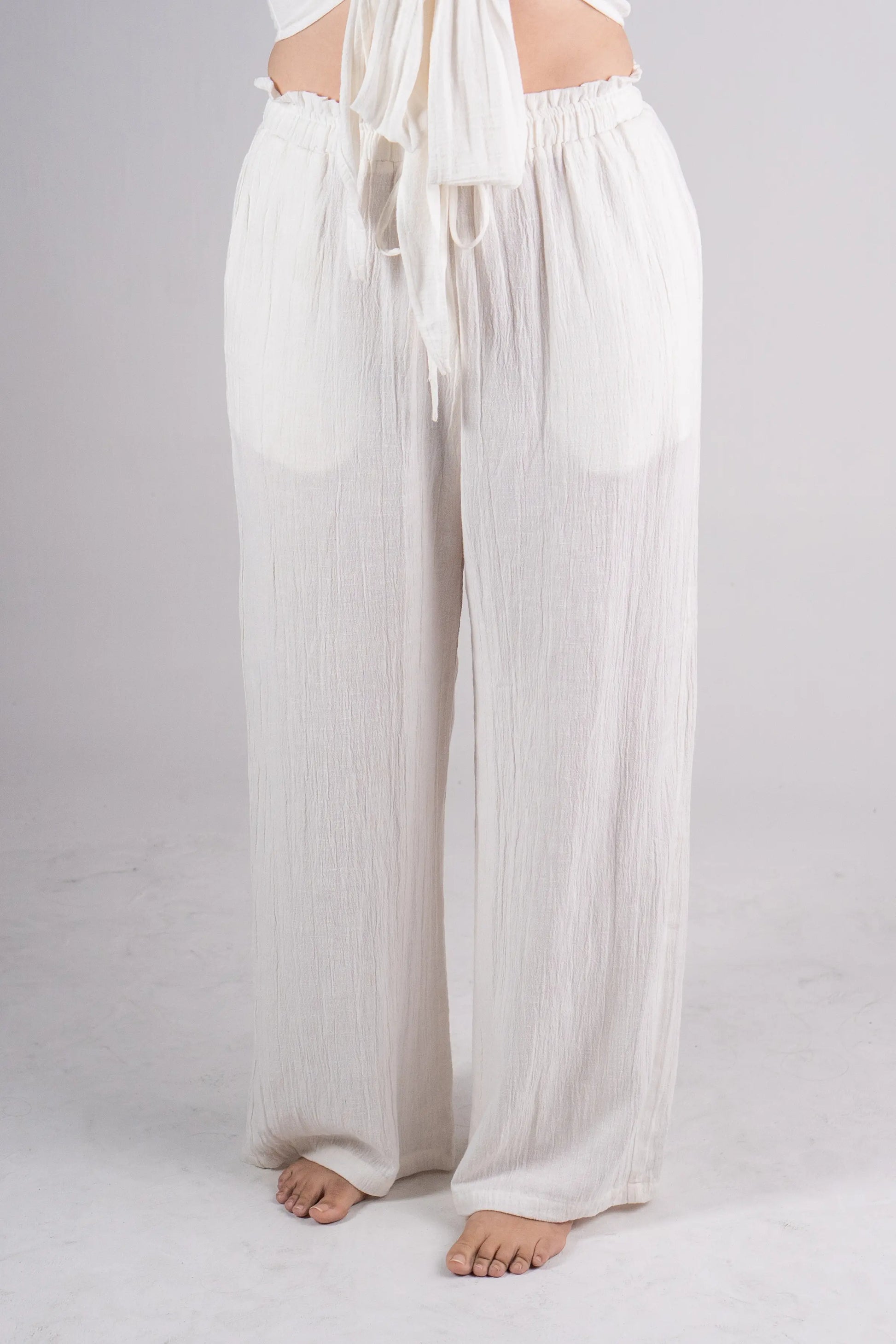 Cut from a breathable 55% linen and 45% viscose blend, they feature a soft elastic drawstring waist and roomy side pockets for ease and comfort. Because they’re unlined, we recommend pairing with neutral-toned undergarments - if concerned. Complete the set with our matching Linen Dolman Sleeve Tie Front Top. Each pair is part of a small-batch run, made with care by our team in Danang.